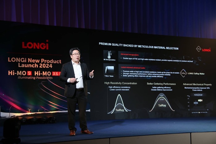 ลอนจี (LONGi) โดย บริษัท ลอนจี กรีน เอเนอร์จี เทคโนโลยี จำกัด ผู้นำด้านพลังงานแสงอาทิตย์ระดับโลก จัดงาน ‘LONGi New Product Lunch 2024 And Press Conference’ เปิดตัวผลิตภัณฑ์ใหม่ล่าสุด 2 โมดูล Hi-MO X6 MAX และ Hi-MO 9 ผลิตภัณฑ์ใหม่ที่จะกำหนดอนาคตของนวัตกรรมพลังงานแสงอาทิตย์อย่างเป็นทางการ รวมถึงประกาศการทุบสถิติประสิทธิภาพการแปลงพลังงานสูงสุดของโลก พร้อมเปิดตัว Top Partner ที่สำคัญเพื่อร่วมกันผลักดันพลังงานทดแทน ด้วยเทคโนโลยี Hybrid Passivated Back Contact ในตลาดโซลาร์เซลล์ประเทศไทย ยกระดับการขับเคลื่อนอย่างเต็มศักยภาพเพื่อให้บรรลุความเป็นกลางทางคาร์บอน Net Zero อย่างมีประสิทธิภาพและยั่งยืน