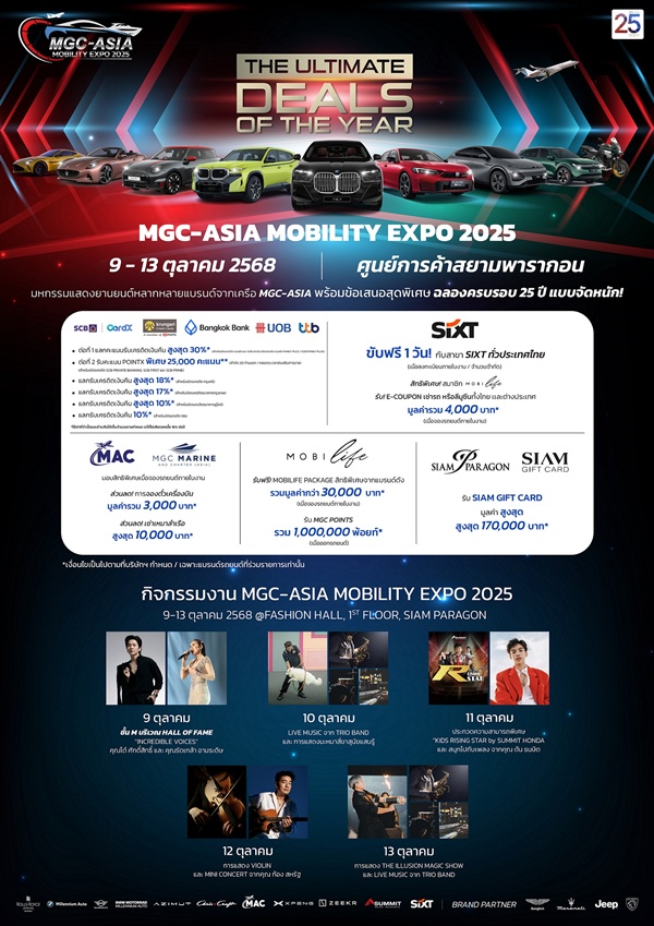 มหกรรมจัดแสดงและจำหน่ายยนตรกรรมแบรนด์ดังระดับโลก ‘MGC-ASIA MOBILITY EXPO 2025’ จัดขึ้นอย่างยิ่งใหญ่ บริเวณชั้น M, 1 และ 2 ศูนย์การค้าสยามพารากอน ตั้งแต่วันนี้ ถึง 13 ตุลาคม 2568