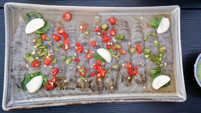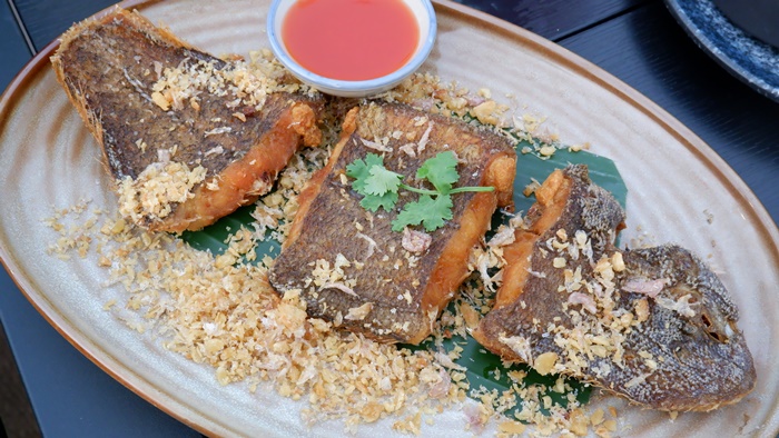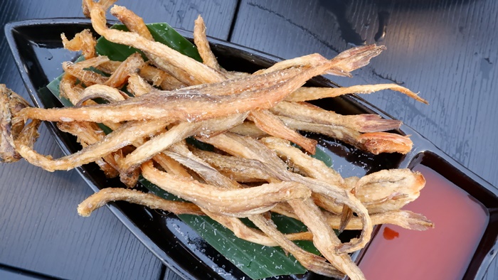 เริ่มต้นกันที่เมนูเรียกน้ำย่อย ปลาหัวยุ่งทอด เป็นเมนูหาทานยาก ปลาหัวยุ่งเป็นปลาน้ำจืด ตัวยาวๆ คล้ายปลาตีน (เป็นตระกูลเดียวกัน) หัวใหญ่และยุ่งเหยิง ก็เลยเรียกว่า “ปลาหัวยุ่ง” นำมาทอดกรอบ ทานคู่กับน้ำจิ้มซีฟู้ด เรียกน้ำย่อยได้ดีทีเดียว