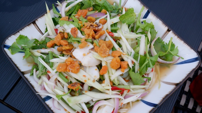 ยำไข่สามสมุทร จานยำที่ใส่ 3 ไข่ คือ ไข่ปลาริวกิว ไข่ปู ไข่ปลาหมึก ใครชอบไข่ปลา จานนี้จัดให้จุกๆ ยำใส่มะม่วง รสจัดจ้าน สดชื่น เคี้ยวสนุก