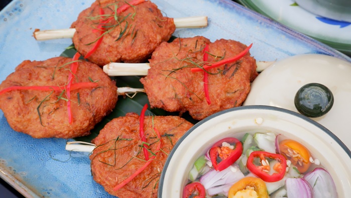จานต่อมา ทอดมันอึกทึก เป็นอีกหนึ่งเมนูซิกเนเจอร์ของทางร้านที่ทุกโต๊ะต้องสั่ง ใช้เนื้อปลาอินทรีย์สด คลุกเคล้ากับเครื่องแกง นวด ตบ จนเนื้อเด้ง ก่อนนำไปปั้นเสียบด้วยก้านตะไคร้เพิ่มความหอม นำไปทอด ทานคู่กับน้ำจิ้มอาจาด อร่อยมาก เราเป็นคนชอบทานทอดมันมาก แต่หาทอดมันที่อร่อยถูกใจยากมาก ทอดมันอึกทึกเป็นอีกหนึ่งที่องต้องปักหมุดไว้เลยว่าอร่อยถูกใจ เนื้อปลาเด้ง รสชาติกลมกล่อม ไม่เผ็ดเกินไป