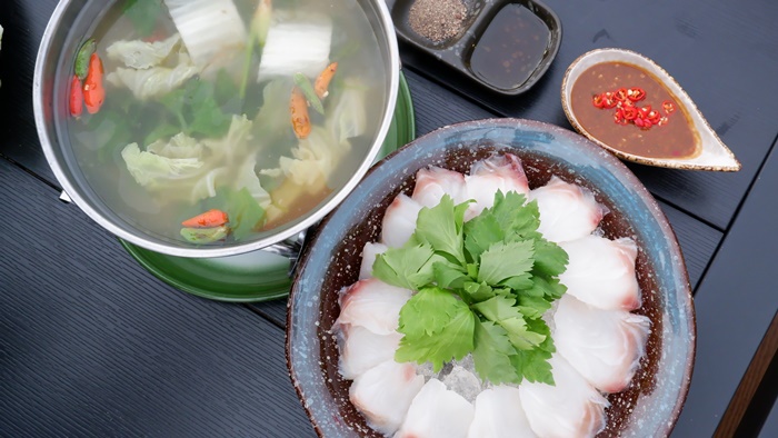 มาดูเมนูหลักของที่นี่กันบ้าง เมนูแรกที่อยากแนะนำ คือ “เซ็ทหม้อไฟ ปลานิลสายน้ำไหล เบตง” เป็นซิกเนเจอร์ที่หาทานยาก มีเสิร์ฟเฉพาะที่นี่ เพราะส่งตรงมาจากยะลา เสิร์ฟมาพร้อมหม้อไฟที่ปรุงรสน้ำซุปด้วยสมุนไพรกลิ่นหอมที่ลงตัว ช่วยชูรสชาติเนื้อปลายิ่งขึ้น